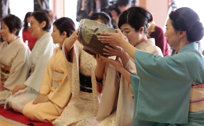 鎌倉時代、お寺の再興に感謝した叡尊上人が参拝者にお茶をふるまったことが由来とされる伝統行事です。直径30センチ以上ある大きな器に注目が集まりますが、西大寺から出土した日本最古の金貨「開基勝寳」を象った干菓子も、この時だけのお楽しみ。